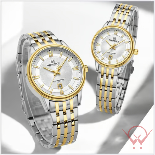 Product details for Naviforce 8039 Couple Steel/Golden Wrist Watch